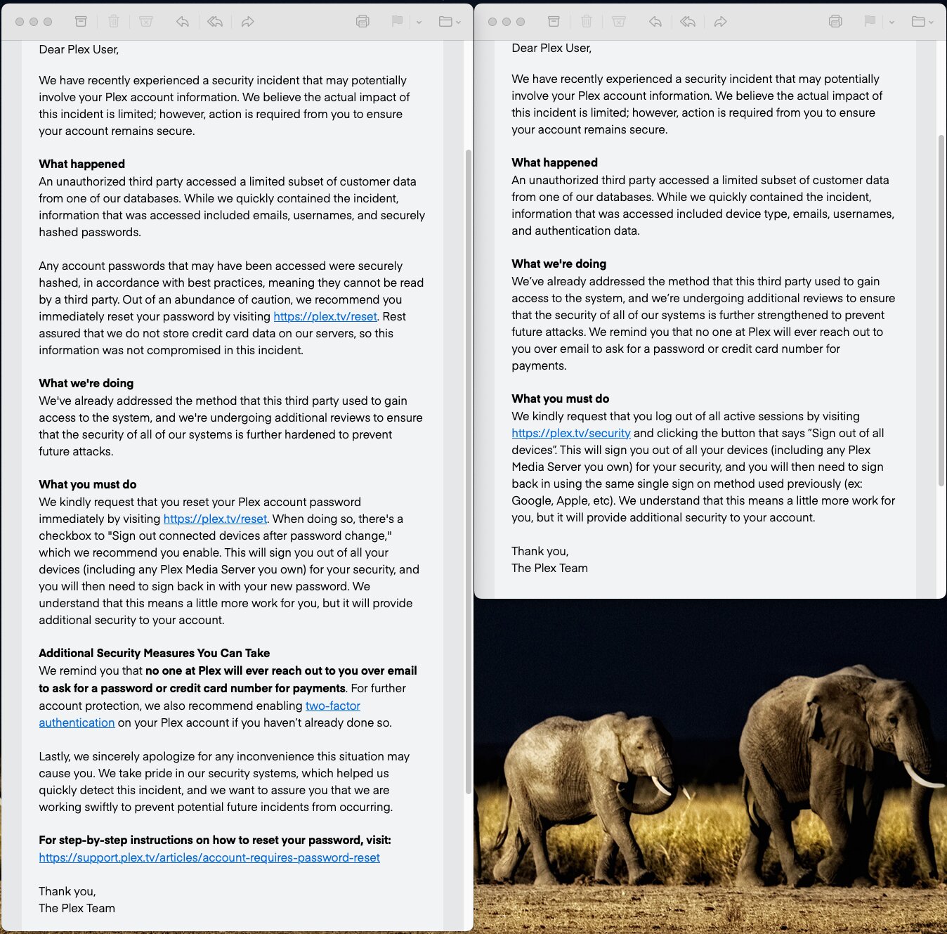 I won’t lie, I was a little peeved when I read about the breach in my Google News feed before I heard anything officially from Plex - only way I could confirm what I was reading was seeing the forum post about it… I then received 2 emails about it several days later.