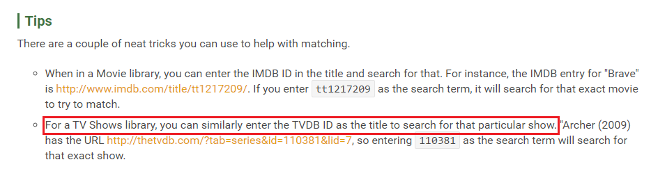So, why not add a space in Search Options under Match where you can add the series ID Number? Then it wouldn’t even have to go search the entire library…it would load the information for that ID number. Seems this would solve all the NOT FOUND issues when the show IS there.
