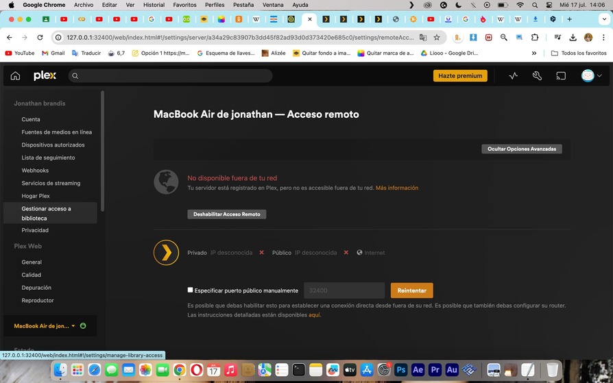 Help! I can not enter plex remote access I get a message unavailable, previously if I could see my videos on the tv and I have shared to two people nothing more :(, how can I get back to have the green check for remote access. Here are two images of the problem one is with my wifi internet and the other with a family member’s wifi internet. Thank you I look forward to your response!!!