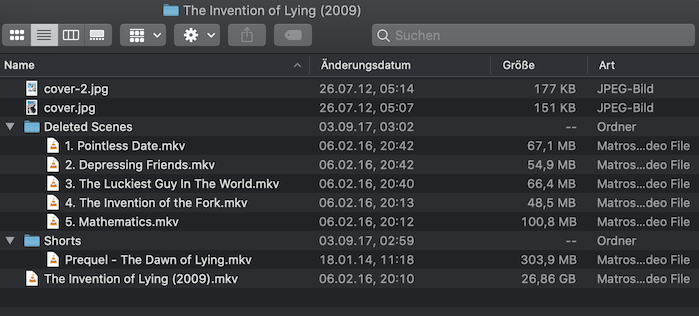 Find below an example of how to structure local extras for Plex to pick them up. This example is based on the movie The Invention of Lying from 2009. The movie folder contained by the folder that’s linked to my movie library in Plex ([library folder] > The Invention of Lying (2009)).