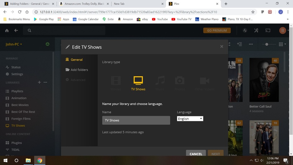 I think I have found some sort of solution. I’m using the latest Chrome browser. Once I add folders and then the advanced button greys out, I have hit refresh for browser page and it makes it right. This is the reason I have deleted Windows 10 about 7 or 8 times, too many problems with the os working with other programs. Windows 7, never had any kind of problem with Plex, except the normal subtitles snafu.