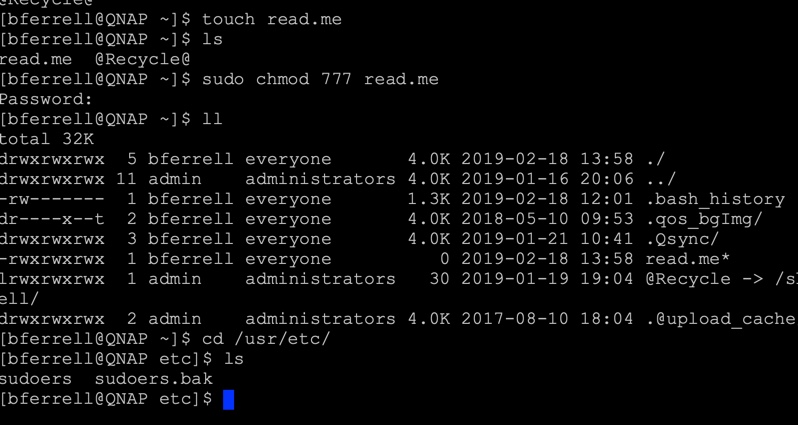 Attachment: An example of me "sudo"ing to admin to change a file’s permissions.