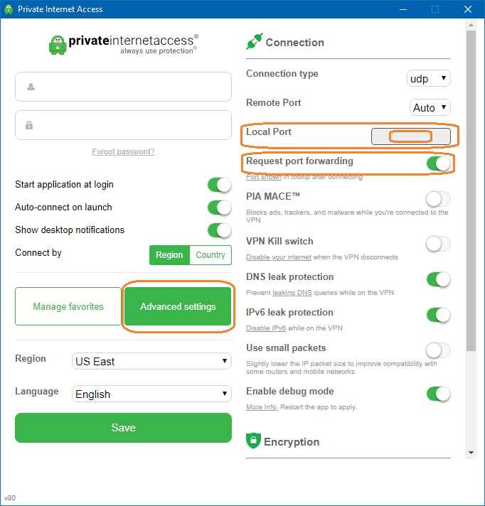 Enable port forwarding in the application by entering the Advanced area, enabling port forwarding and selecting one of the following gateways: