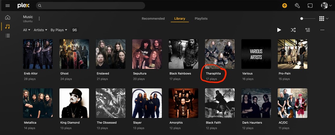 Going to Music->Library, show all artists and sort by play counts shows a play count number for specisic artist.