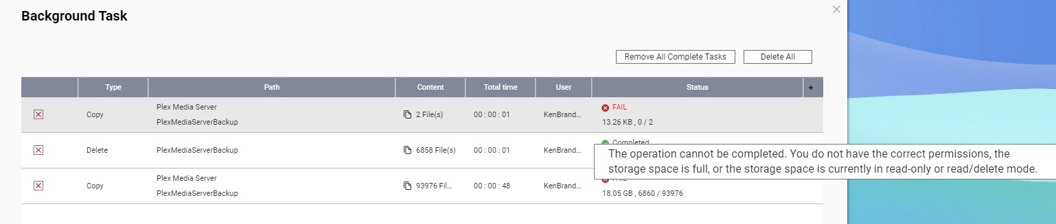 However, the problem is that the Plex Media Server folder is inaccessible in File Station. When I try copy it, I get this error message: