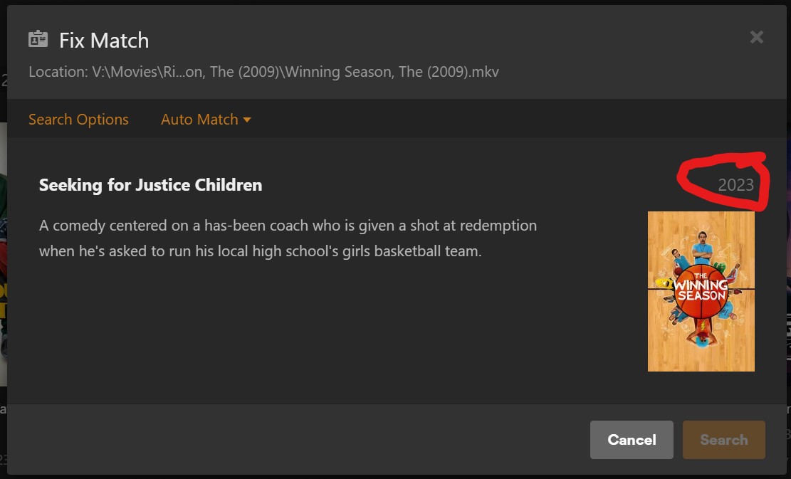 The main issue I have is with the release date. Plex keeps setting the date as 2023. I thought the title was an issue, but it looks like that’s on IMDB’s side. You can see both IMDB and TMDB have the year as 2009, but this is what I see with the plex agent: