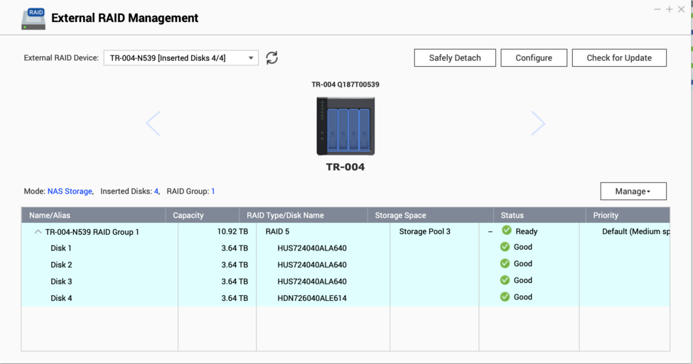 So, i have a Qnap TVS-951X running raid 5 -4-8tb drives. I recently purchased a TR-004 as a backup DAS. On the advice of a Qnap forum member, I set the raid to 5 as well, 4-8tb. I can’t figure out how to set up backup using QTS. Just not familiar with the terms, yet. Also I was wondering if raid 5 is the best way to go. I end up with so little volume for each NAS/DAS. I was thinking of going to raid 0 on the backup, transferring all and then restoring to Nas after reconfiguring TVS to raid 0. Any thoughts?