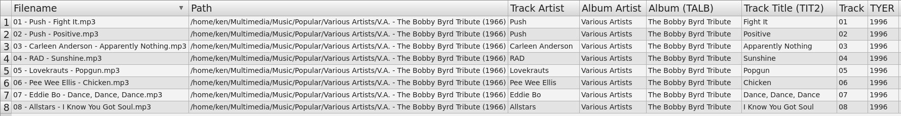 Album title in the Album tag - This should also be The Bobby Byrd Tribute 1996. This could be causing Plex to incorrectly match the album to MusicBrainz.