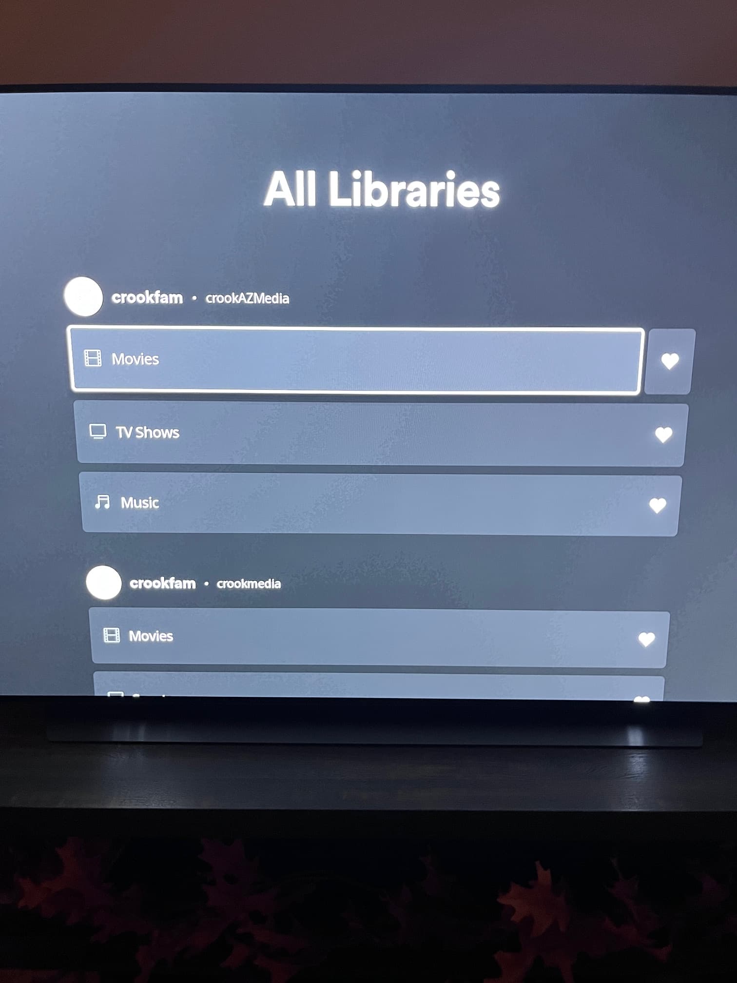 I’ve two Plex servers on my home network. With libraries favorited from both servers, my Roku shows the server name under each library, not my Plex username.