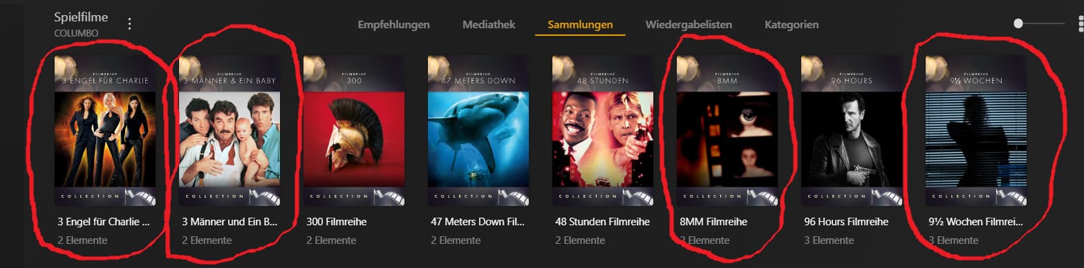 All these collections shown in the picture are created by Plex (using the info from TheMovieDB with posters created by myself - but I also use smart collections which get involved later). I marked a couple of collections to show differences. All of these marked collections contain 2 movie items (one is holding 3).