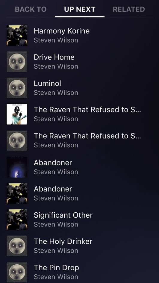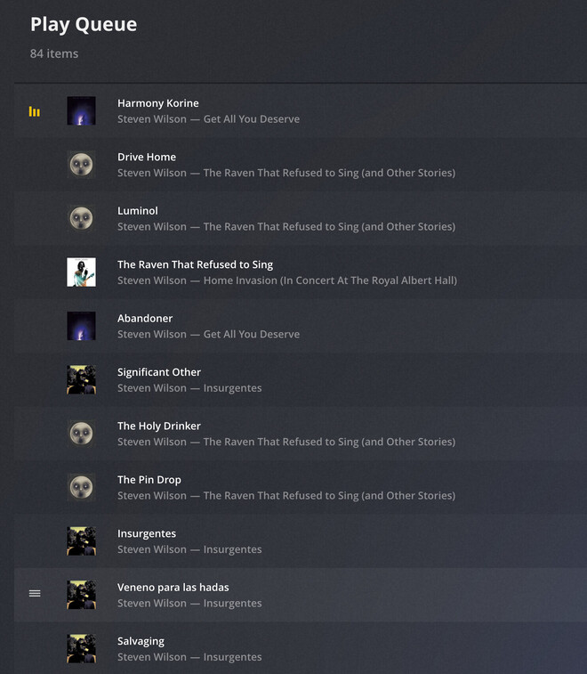 Playlist resulting from playing in Plexamp (it’s playing “Harmony Korine” right now, as was in the popular track list, and the next song is “Harmony Korine” the album version). See other duplicates such as “The Raven that Refused to Sing” and “Abandoner”.