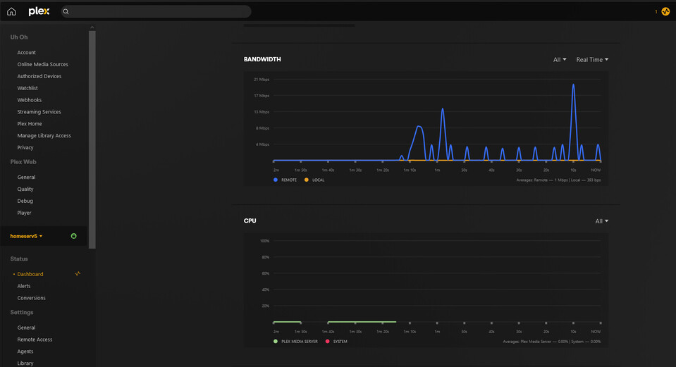 Plex Web as well as Plex Dash will not show any usable data regarding CPU usage or Plex CPU usage. Server as well as Plex server have been restarted multiple times. No changes to display graph. Erroneous green lines may appear and then vanish. Percentile readings always remain at 0% regardless of actual use.