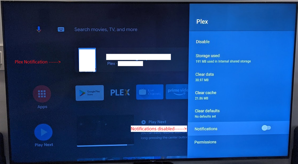 The part that makes this in fact a bug, is that if notifications for the Plex app are disabled in Android TV, it still does this. So it’s not honoring the Notifications settings within Android TV. See picture below: