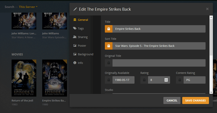 If you are having trouble seeing what movie is what, you can change the title to help you. Just make sure you leave the sort title in tact and everything will still be in order and searchable. Since you showed Star Wars, here’s how you can make that look.