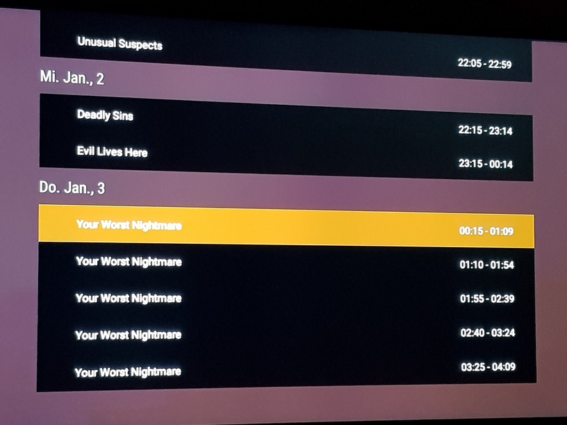 On the Fire TV, this Grid looks more like a table, wide buttons with the series title and the recording times. So far, so good.