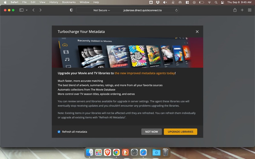 I recently upgraded my Plex server on my Synology DMS (running DSM 7.1-42661 Update 4). When I login to the Plex server control panel (e.g. localhost:32400) I immediately receive a pop-up with a sync icon, and then before I can read it, it’s covered by a pop-up asking if I want to upgrade my libraries to the new metadata: