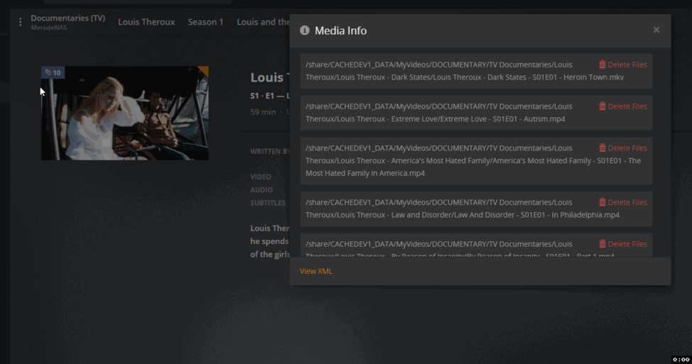 First, all episodes in the parent folder, no subfolders and just named with the main title of the series, leaving out ‘Louis Theroux’ at the beginning, thinking it could be redundant since it’s the name of the parent folder
