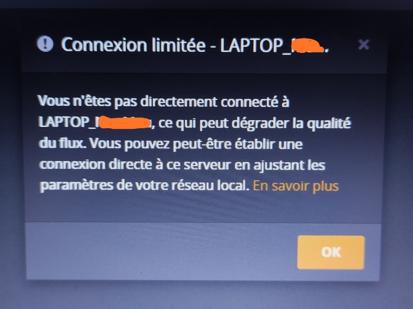 Ne trouvant pas de réponse à mon soucis j’ai lâché l’affaire et aujourd’hui en rallumant Plex j’ai eu ce message (sur la photo).