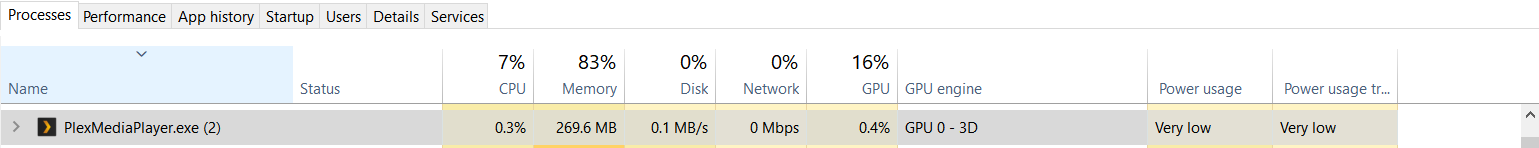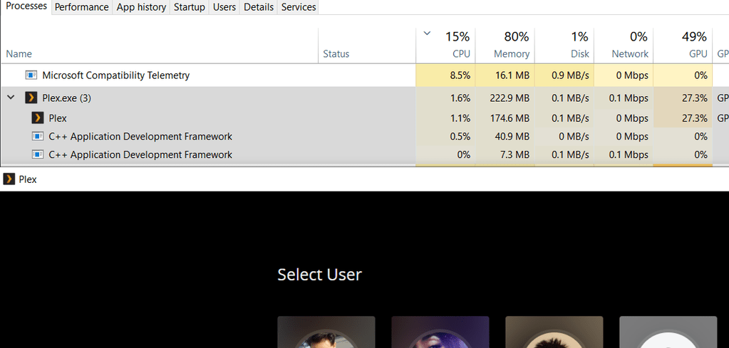 I find it strange that the Plex Windows app is behaving poorly. For starters, the player will use 70-80% CPU, just from idling as soon as I am logged in. If I just wait at the “user selection screen”, it “only” uses around 10% (which is still high).