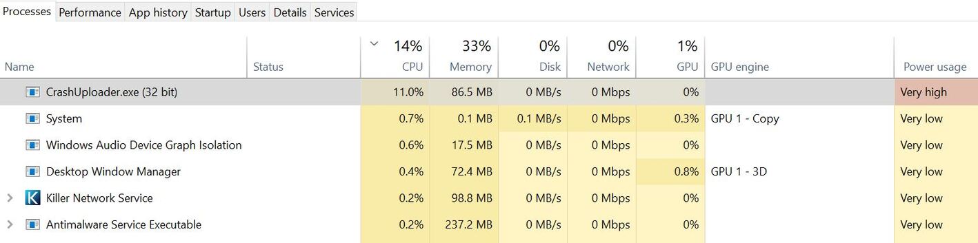 The “Power Usage” column in the Task Manager is always “Very high” for “CrashUploader.exe” as well.