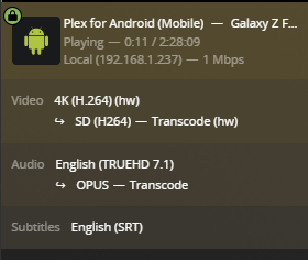 Now if I open Plex on my phone and force it to play 480p for testing purposes, I have the following show up in Activity on a 4K non-HDR video: