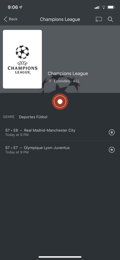 If I then tap on an individual episode at that point, I get the show details screen/view which include episode description and airing time and channel.