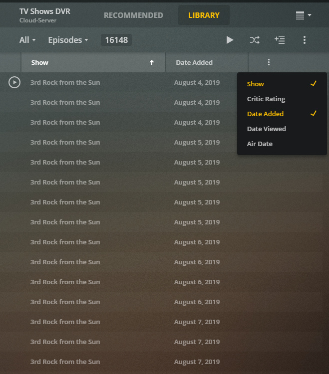 When I go to my TV Shows library that the DVR feeds into, I like to show the latest added episodes and list their duration. This way I can check for failing recordings like the 9 minute episode of Bewitched you can see below. This was possible in the Plex Media Player and is still possible in the web app, but it is not possible (that I can see) in the new app. The options for what columns to show (and therefore what to sort by) have been severely reduced.