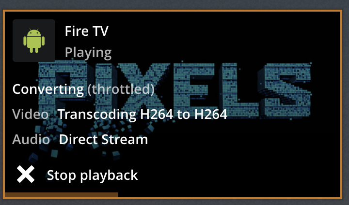 I believe I know why this is happening. I went to my friends house tonight and look at his settings on the FireTV. It’s set to 4Mbps 720p, but the movie is 1080p. Plex is having to transcode the movie, because it’s being played at 720p. Does this sound correct?