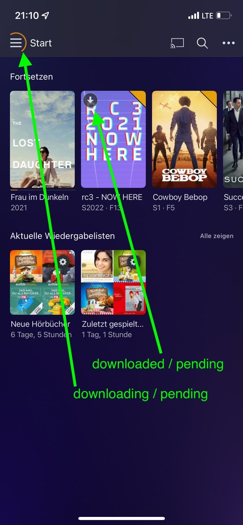The Problem with the arrow down is, if your are outside your network you could think the file is downloaded, but if not, playback starts and you use your mobile data. worst case is a big video and your monthly data is gone.