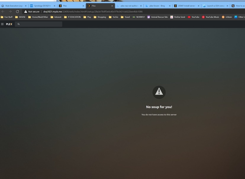 If I try to access the server via the URL provided on the Synology box: HTTP://xxxx.xxx.xxx:32400/web, I get a message: No Soup For You, You do not have access to this server. In either case I’m totally confused.