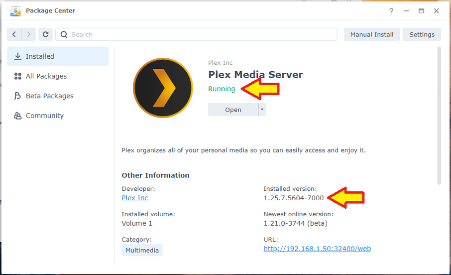 Example: Intel 64-bit version PlexMediaServer-1.25.6.5577-c8bd13540-x86_64_DSM7.spk