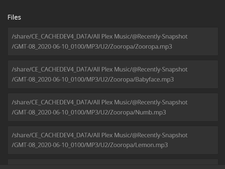 I totally agree with you. I am wondering several things. I can’t be the only one using Plex and Snapshots on their Qnap devices. Why did this happen in my setup and only in my music folder? How do I recover from this and get back to the way it was originally running with no duplicates? How do I direct Snapshots to another folder and/or make the folder hidden? There seems to be nothing in File Station or Snapshots to allow me to do this. Thank you for your reply, I appreciate it!