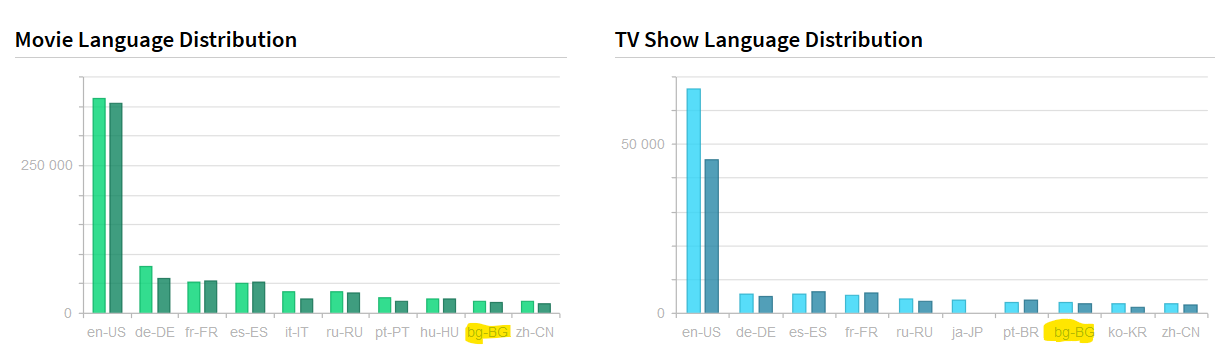 Last month Bulgarian became in Top 10 for movies, and it resides for a long time in Top 10 for TV series in TMdb.