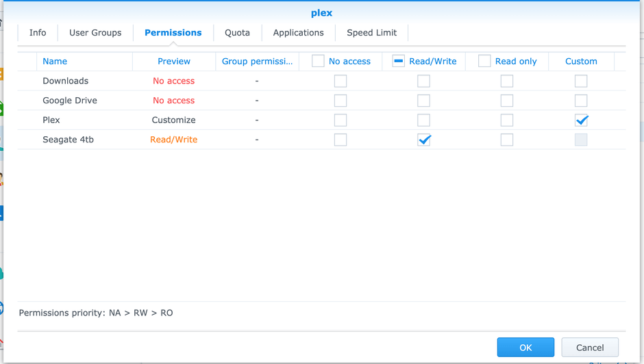 I have followed the instructions on the link that Otto sent. It works fine, but I have to give Plex user Read and Write access, otherwise I get a playback error because the transcoding would not work.