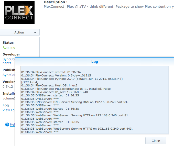 Did any one have a fix for this, was using version 0.3 fine but upgraded to version 0.5 and same issue. Tried upgrade and re-install. Any help greatly appreciated. followed the install guide/troubleshooting as per https://forums.plex.tv/topic/72356-plexconnect-on-synology/