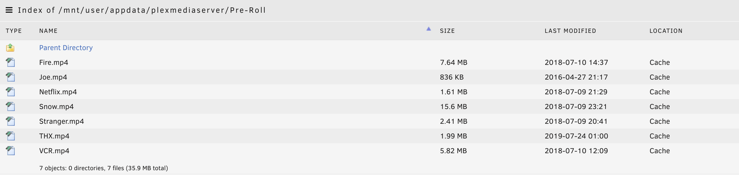 I have a folder on my server located in Videos called Pre-Roll (see the aforementioned links) and i’ve also got a folder located at appdata/plexmediaserver/Pre-Roll where i’ve tried putting the files too. It used to work just fine when I copied the url of the file from the plex web ui but that stopped working some time ago.