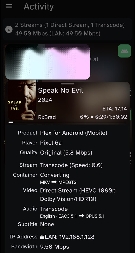 I’m also seeing scrambled DoVi Profile 8 playback – specifically on the Android app (on my Pixel 6a phone). Of note – this is using “Play Original Quality”. Picture-in-Picture screenshot with Tautulli below: