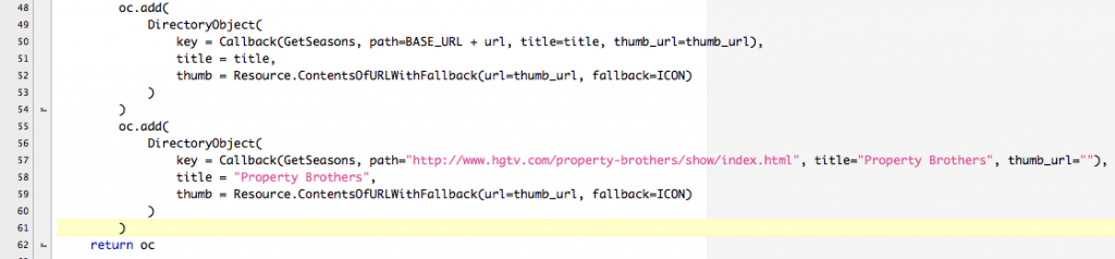 Make sure to get the tab spacing correct (python relies on this for proper syntax). I didn't test this code but it *should* work in theory. This is not a pretty way to do it (and I wouldn't include this in the actual channel code). Property Brothers should show up as the last item in the show list and will hopefully just work in terms of the episodes -- I didn't look that closely at the actual page but it seems in line with the other episode pages.