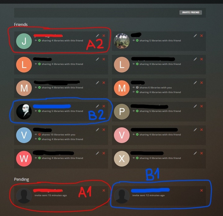 We can still see my first attempt at inviting him without plex account (pending invite A1) but also the second attempt: his accepted friend request (A2) to which I shared my libraries.