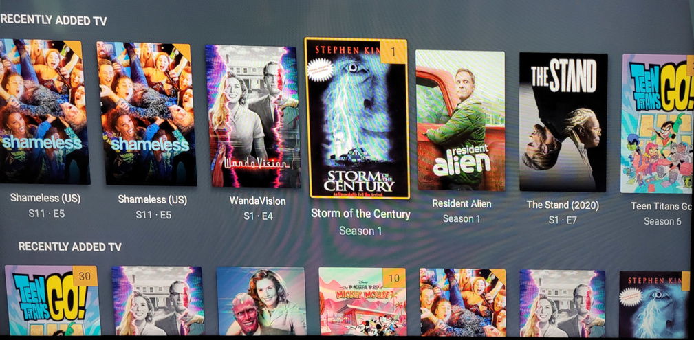 From the photos, I have two rows of Recently Added TV, Both rows show content from the two libraries, but as you can see, they are not identical. I can’t even figure out which row is supposed to be for which library. One row has two instances of Shameless S11E05, repeated with a second instance in the second row. Teen Titans Go shows up in both rows, as does WandaVision and several others. The second rows order is completely random, definitely not in the order they were added.
