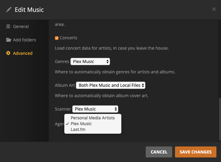Please show us a screenshot, where we can change settings for the Plex Music Scanner/Agent.