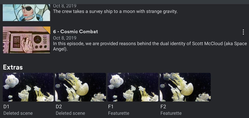 Episode Level: Space Angel (1962) s01e05 Expedition to a New Moon-deleted and Space Angel (1962) s01e05 Expedition to a New Moon-featurette appear in Plex Android Mobile below the video/audio/subtitles information. They do not appear in Plex Web.