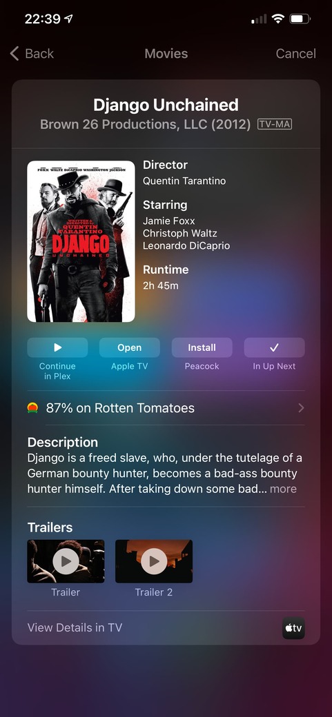 On iOS, if you use the global search in the system Notification Center or the Apple TV app and search for something that we have in our online catalogue, it will offer to open it in our app. Here’s an example of a search for Django Unchained in iOS.