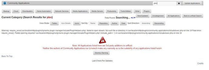 And the Community Applications plugin won’t display any containers. If I click on any of the tabs or search for something it just constantly says it is searching but nothing every comes up