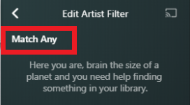 After applying all desired rules, results can be viewed by navigating back to browsing (< icon top left corner). All filtered items can then be browsed through as normal, or they can be Played, shuffled, Added to or create new playlist, or downloaded.