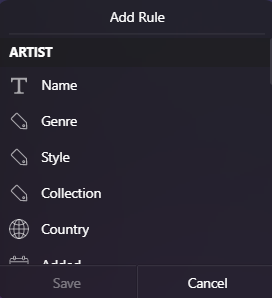 When Add Rule is selected several filter types are available for the three Browsing Categories: Artist, Album, Track. All category filters are available and can be applied regardless of the current browsing state. These can be viewed by scrolling up and down in the Add Rule dialog.