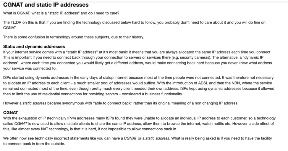 My hope & assumption is that the “static” IP address he was given is not behind CGNAT. CGNAT doesn’t have to be all-or-nothing for all customers and IP addresses of an ISP.