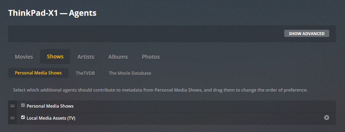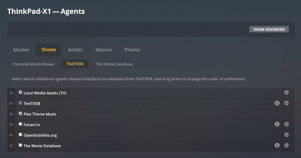 Since your library uses TheTVDB agent, you must click on ‘TheTVDB’ under Shows, to see the settings of this agent.