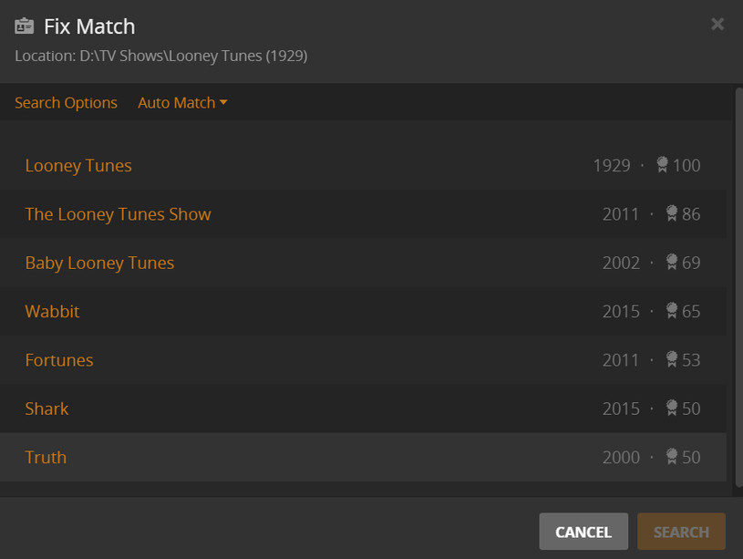 When I added “(1929)” to the end of the Looney Tunes folder name, Plex’ accuracy did increase. Under Fix Match, I now see this: