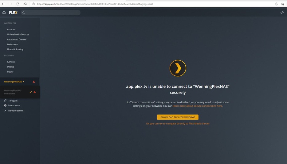 I am on the latest Win 10, all updated, am logged in to my verified Plex account and am trying to access the server by clicking on Open Plex…